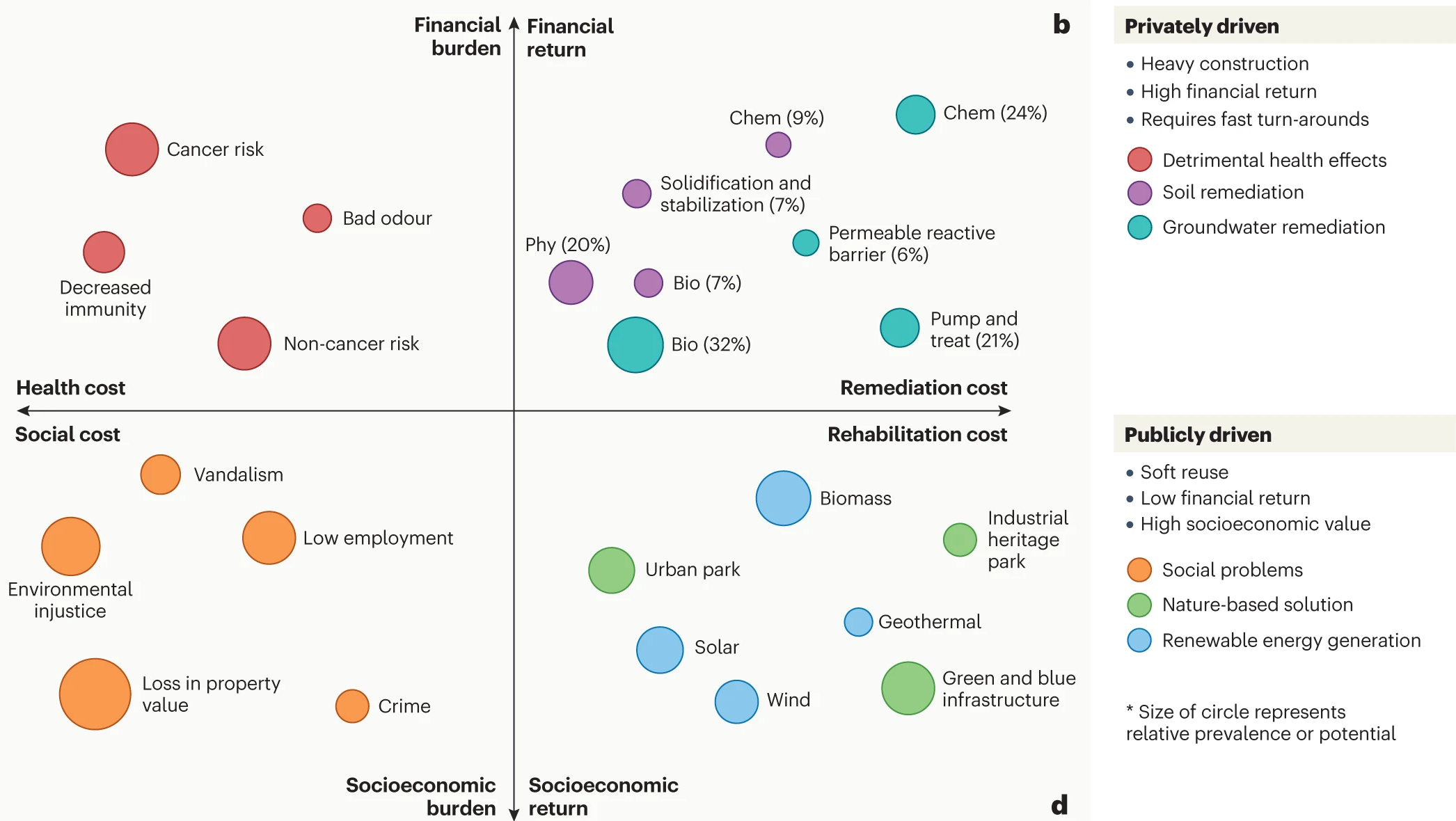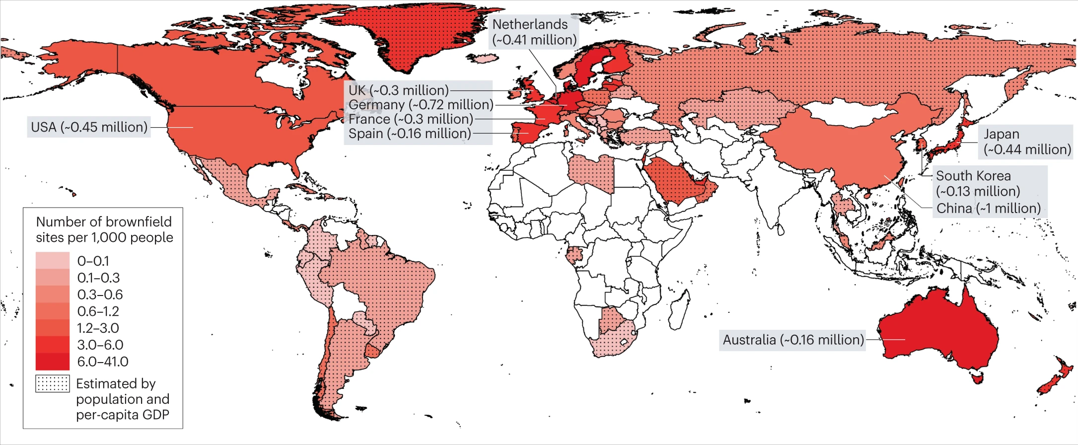 全球范围内工业场地造成的土壤与地下水污染问题日益凸显,严重威胁粮食安全、饮水安全和人居安全。该研究基于近40个国家和地区的污染地块信息,构建了潜在污染地块与经济规模、人口密度等的定量关系模型,首次估算了全球“棕地”数量超500万块(图1)。工业场地污染一方面加剧了土壤与地下水等环境污染,另一方面也伴随着地块闲置或不良使用带来的犯罪、失业、社区不公平等问题,从而严重限制了城市的发展潜力。