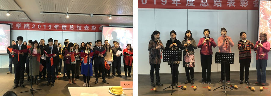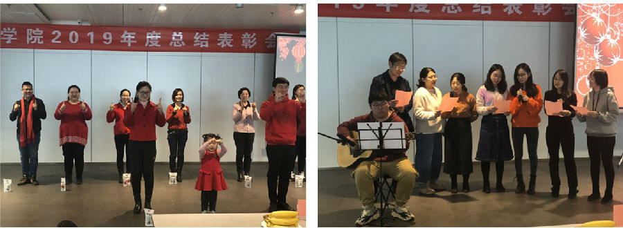 副院长吴烨、蒋靖坤宣读了2019年院级优秀工作者和先进集体的名单并颁发证书。院党委副书记吴静、院工会主席陈超宣读了2019年院工会表彰名单并颁发证书。院党委副书记吴静代表学院为2020年迎来七十寿辰的离退休老师送上了寿礼。院党委副书记席劲瑛、院工会主席陈超向本命年教职工赠送礼物并送上了祝福。
