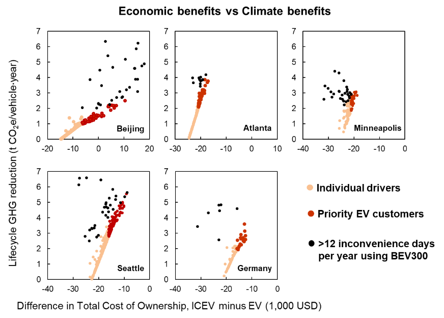图2:未来电池制造成本持续下降将使得更多BEV300车主获得总持有成本降低的经济效益(左);不同城市和不同个体间全生命周期温室气体排放分布差异显著(右)