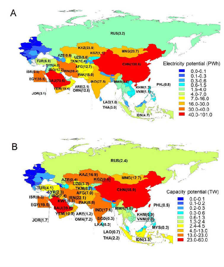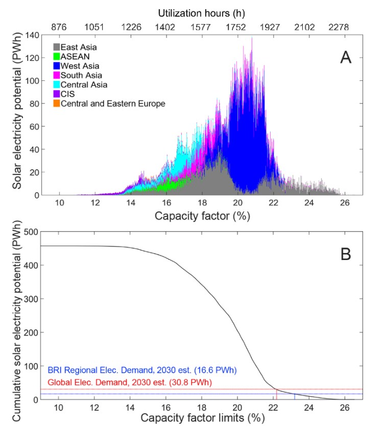 (A)“一带一路”沿线国家太阳能光伏年发电潜力;(B)光伏装机潜力