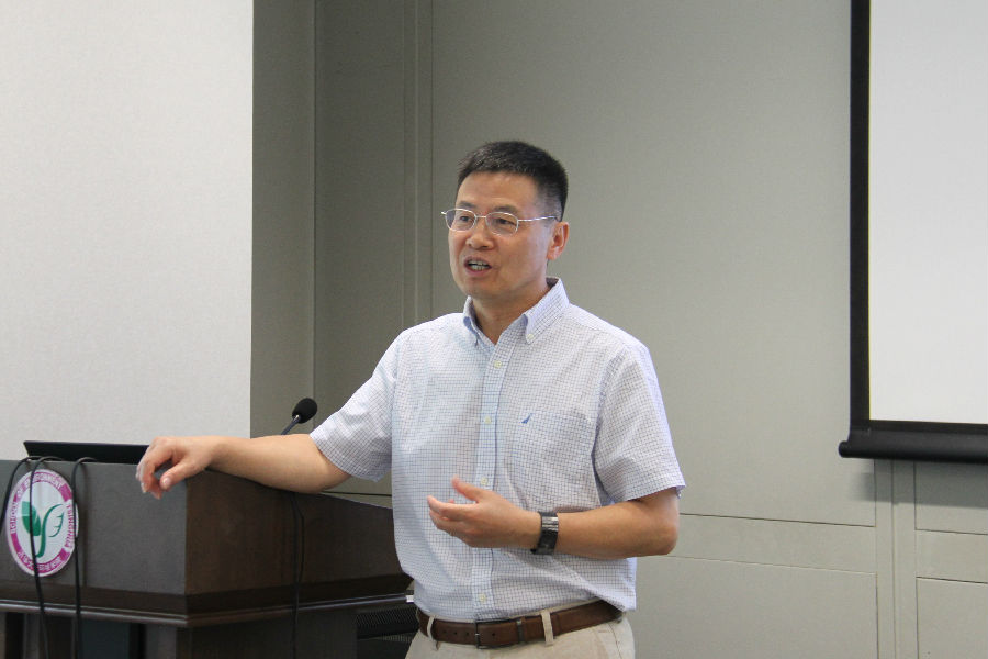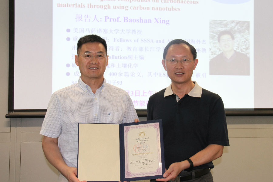 聘任仪式后,邢教授作了题为《利用碳纳米管探索可电离有机化合物在碳质材料上吸附机理》(New mechanistic insight into adsorption mechanism of ionizable organic compounds on carbonaceous materials through using carbon nanotubes)的学术报告。邢宝山教授重点介绍了他在可电离有机化合物吸附于碳质材料上新机理方面的研究工作。除普通的共价键,取代,π键作用外,借助H离子架桥作用的电荷辅助氢键(Charge-assisted H-bond, CAHB)对低浓度下可电离有机化合物在碳质材料上的吸附有重要贡献。这项研究通过提出猜想并设计实验验证的方法得到 (-)CAHB主要在pKa相近的电离有机化合物和碳纳米管之间形成,阐明了(-)CAHB 在负电表面材料吸附负离子化有机物污染物中起到的重要作用。邢宝山教授还介绍了新机理从问题提出到实验验证的整体思路,pH值变化量的计算和滴定结果的对比,热力学理论计算等均可以提供依据。该研究成果有望进一步应用于入侵植物的控制,植物根系分泌的有机化合物可通过投加碳材料吸附的方式进行抑制。讲座结束后,邢宝山教授与到场的师生进行了深入的沟通与交流。
