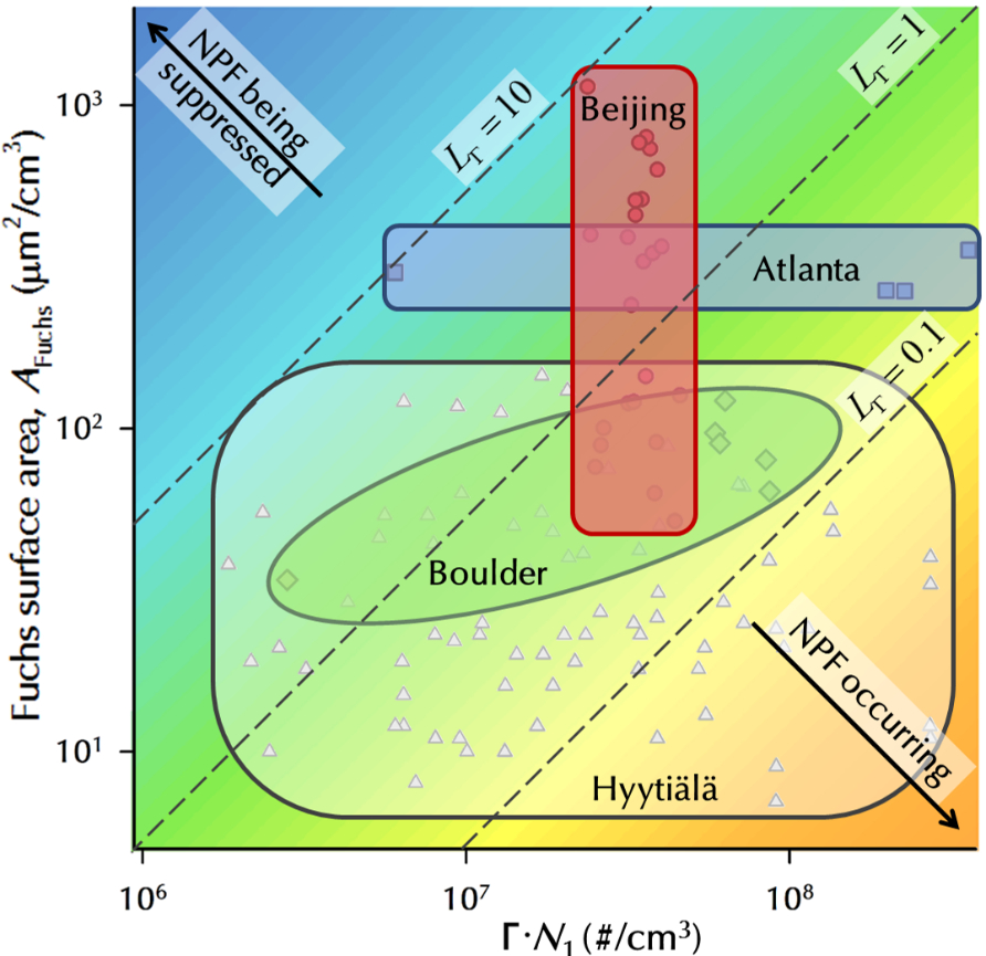 在大气中,气态分子通过成核过程会生成高数量的二次颗粒物,而后通过冷凝过程生长至亚微米尺度,参与大气物理化学反应,并作为云凝结核影响全球气候。颗粒物生成速率是表征上述新粒子生成事件的重要参数之一。必赢电子游戏网站博士生蔡润龙和蒋靖坤教授通过理论推导,提出了适用于高颗粒物浓度下高新粒子生成速率的量化公式。与已有欧美方法相比,新公式改进了对新粒子凝并损失的估算。分析大气观测结果表明,在以北京地区为代表的我国典型城市大气环境的强新粒子生成事件中,新公式估算的新粒子的凝并去除速率占生成速率的50%至90%。应用欧美方法会因低估凝并去除效应而低估颗粒物生成速率。在大气颗粒物表面积浓度较高时,新粒子生成事件因受到凝并去除效应的抑制而难以发生。