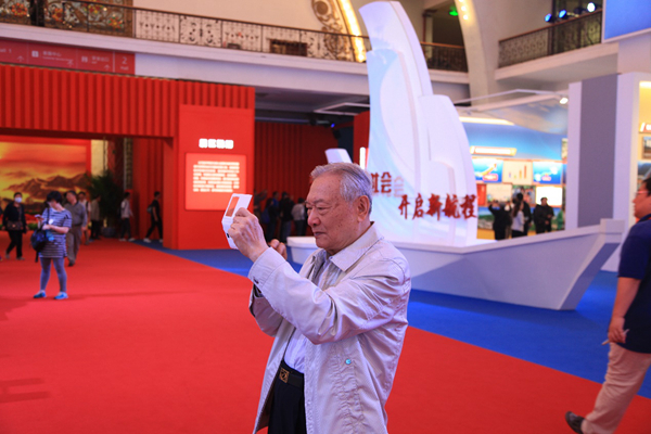 院党委副书记张旭和离退休教师卜城、张兰生等观看展览