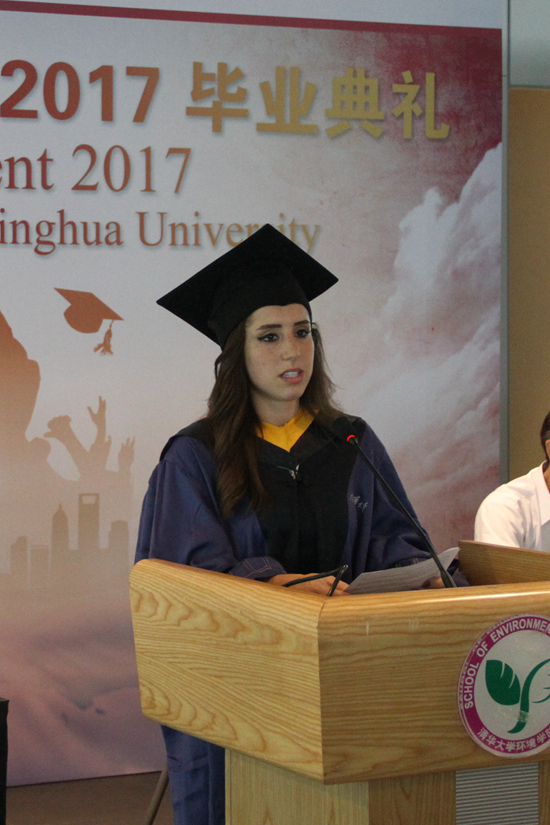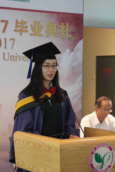 中持环保发展有限公司董事长许国栋作为校友代表致辞。许国栋说,未来五十年将是一个创变的时代,科技将推动社会产生深刻地变革,中华民族的环境梦也将在未来五十年基本形成,环境事业将从污染治理逐步过渡到环境的修复、建设、创造与融合,这对于各位毕业生来说是极大的机遇和责任。最后,他以“肩负社会责任”与学弟学妹共勉,期望清华人勇于肩负推动进步、造福人民的责任,以责任担当为母校增添更多荣光。