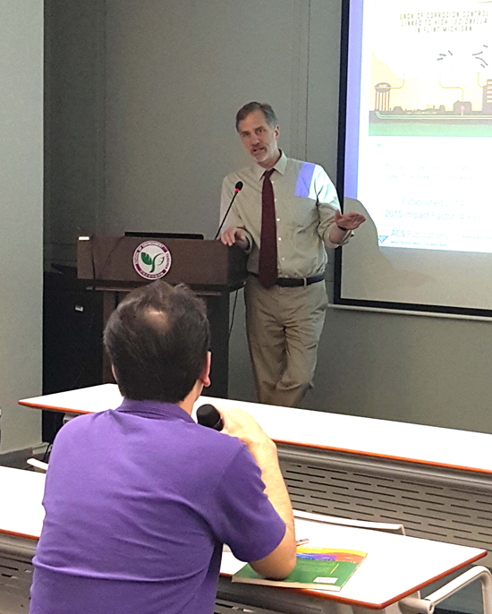 Logan教授重点介绍了厌氧/好氧流化床微生物膜反应器技术在处理低强度污水(微生物燃料电池出水)方面的研究工作。在缺氧条件下,厌氧流化床反应器可以将有机物转化成甲烷,却很难将有机污水降到排放标准。厌氧流化床微生物膜反应器技术是将颗粒流化床(如颗粒活性炭)与微生物膜反应器结合,在低有机供给速率下实现低COD出水。将该技术作为二级处理工艺,用于处理微生物燃料电池的出水,最终COD小于20 mg/L。其中,微生物生长在颗粒活性炭上,可以有效地消耗出水中的有机物和COD,同时颗粒活性炭形成悬浊液,可以通过冲洗膜去除污垢,有效缓解膜污染。此外,Logan教授还介绍了好氧流化床微生物膜反应器技术,将其用于提高整体的处理效果,同时降低厌氧流化床微生物膜反应器技术出水中的溶解甲烷。在讲座结束后,Bruce E. Logan教授与到场的师生进行了深入的沟通与交流。