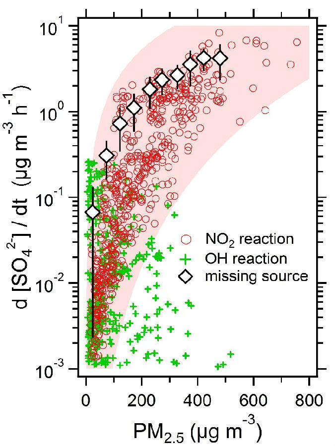 图2:基于观测数据计算所得的NO2非均相反应机制速率(红色圆点)与基于模型模拟估算的重灰霾期间缺失的硫酸盐生成速率(菱形)对比。