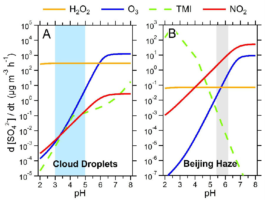 图1:典型云水情景(左图)与北京重灰霾情景(右图)下硫酸盐不同生成机制的相对重要性对比。蓝色、灰色阴影分别代表不同情景下典型pH值范围。