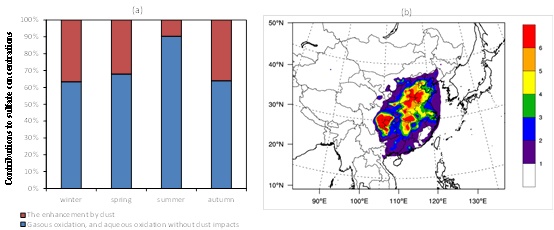 不同反应途径对硫酸盐生成的季节贡献(左图)及矿物质颗粒物对硫酸盐生成促进作用的空间分布(右图,μg/m3)