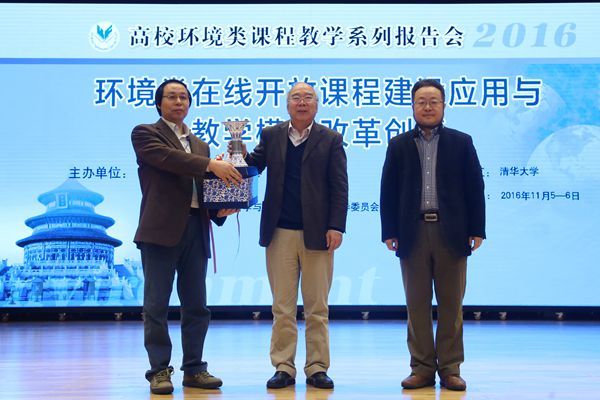 “高校环境类课程教学系列报告会”的前身是“大学环境类课程报告论坛”,自2006年开始已成功举办11届,已成为全国高校环境类教学领域规模最大、规格最高的研讨会。在本届会议开幕式上,高等教育出版社副总编辑林金安代表会议组委会向郝吉明院士颁发了杰出贡献奖,郝吉明院士作为教育部高等学校环境科学与工程类专业教学指导委员会原主任委员,为该系列会议的创办和发展做出了重要的贡献。