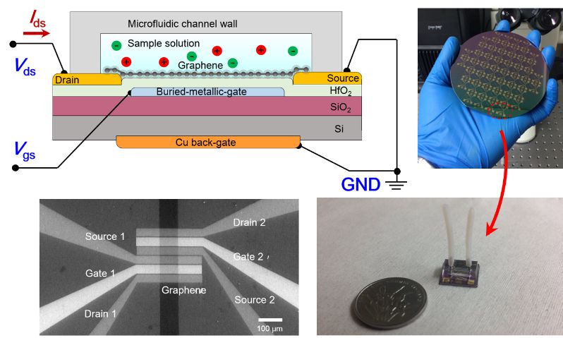 石墨烯因其极高的载流子迁移率被视为最有前途的敏感材料,免标记亲和型石墨烯场效应管传感器是生物传感领域的前沿热点。但是,目前广泛使用的液栅和背栅GFET结构分别存在结构稳定性低(需外置栅电极)和安全性弱(栅压较高)的问题,在器件集成化和实用性方面受到制约。本研究报道的High-κ solid-gate GFET新器件(图1)使用标准MEMS光刻工艺和原子层蒸镀沉积(Atomic layer deposition, ALD)技术制了成高介电常数平面固态栅极。实验结果和理论分析显示,新器件可以在基本保持石墨烯高迁移率的基础上,通过提高固态栅极电容,使GFET器件的跨导参数显著提高,实现高灵敏度检测。