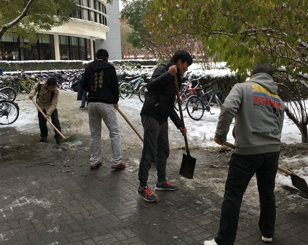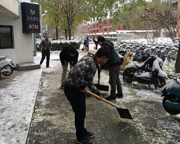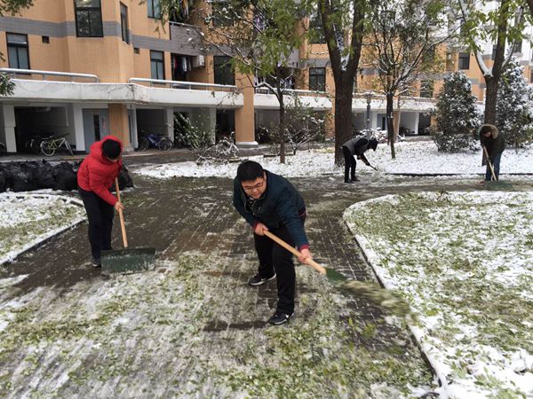 扫雪工作结束后,大家意犹未尽。来自重庆的大二同学王放说:“扫雪蛮好玩的,非常喜欢这样的活动。”和他同班的董恒也因此回忆起自己中学时代去公园义务扫雪的经历。这个冬天,雪虽大,但情更暖。