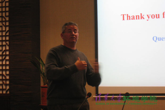 艾比周教授首先介绍了环境地质学研究人员在环境保护领域的角色和所需掌握的地质学、化学和工程等方面的知识技能。艾比周教授分三个主题介绍了环境地质学的研究与发展情况。第一部分介绍了在土壤中设立可渗透性的反应屏障,用于阻挡和处理受污染的地下水;第二部分关于废弃物的管理和废弃物岩土工程技术,包括用于废弃物处理的安全设施,以及填埋场产生甲烷气体的控制;第三部分关于可持续性方法的建立,设计可重复利用的设施,在不影响环境的前提下实现工程系统的优化。报告结束后,同学们与艾比周教授进行了讨论与交流。