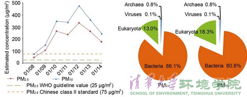 图为2013年1月8日至14日测得的PM2.5日平均浓度(左),以及测序分析得到的DNA序列的生物域分布(右)