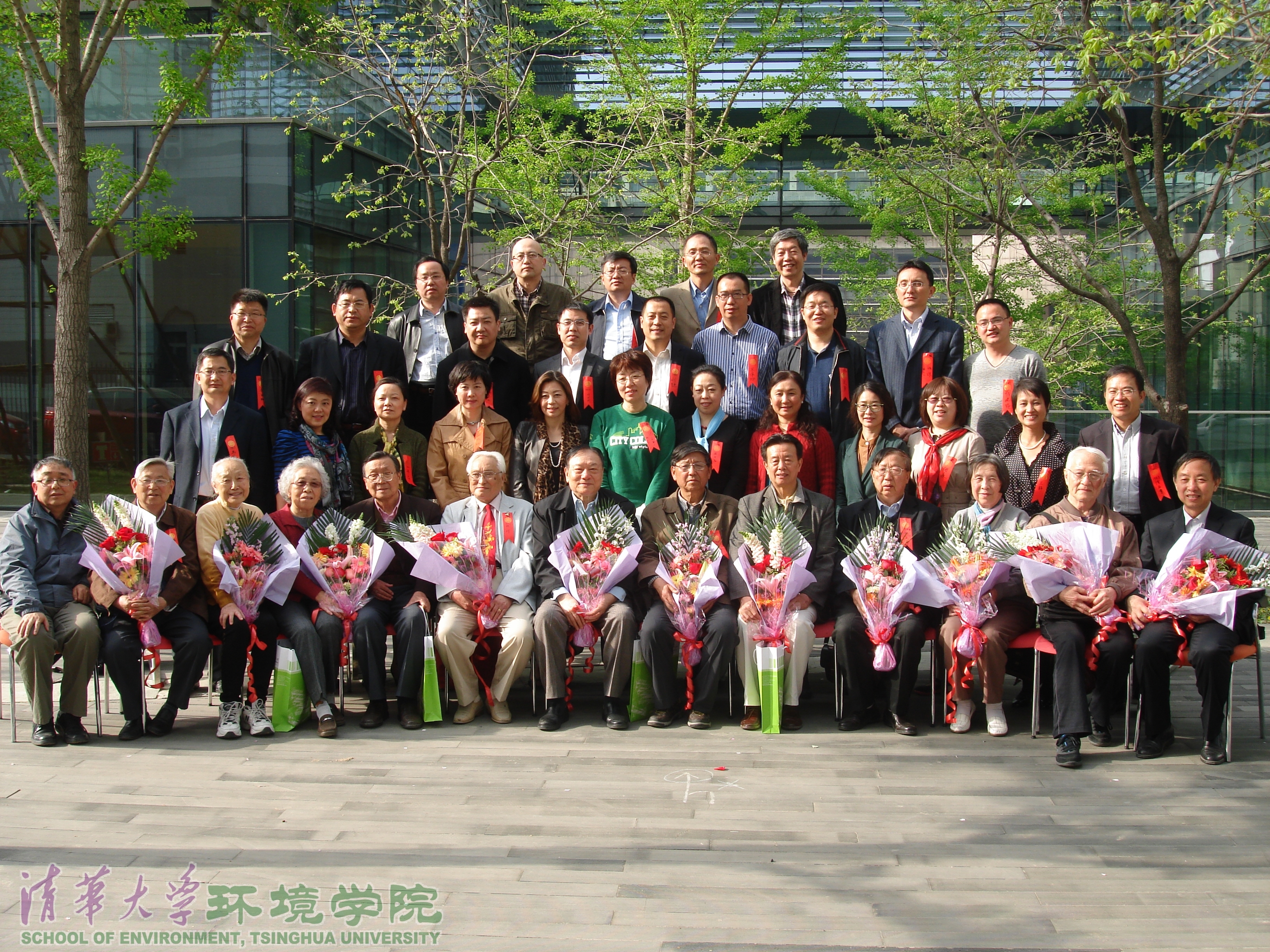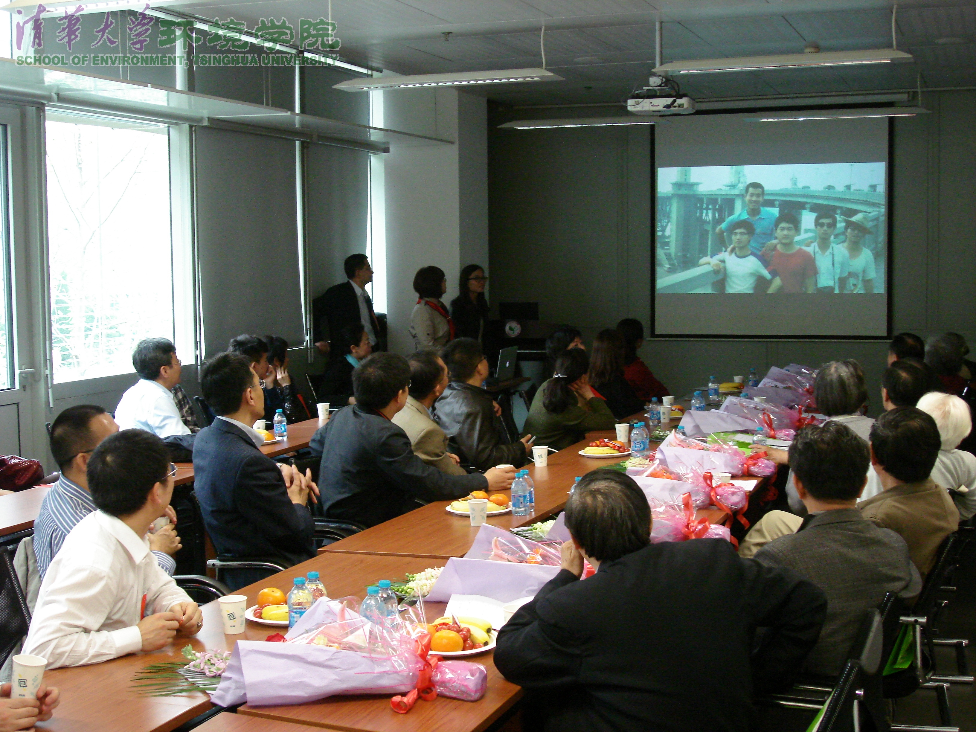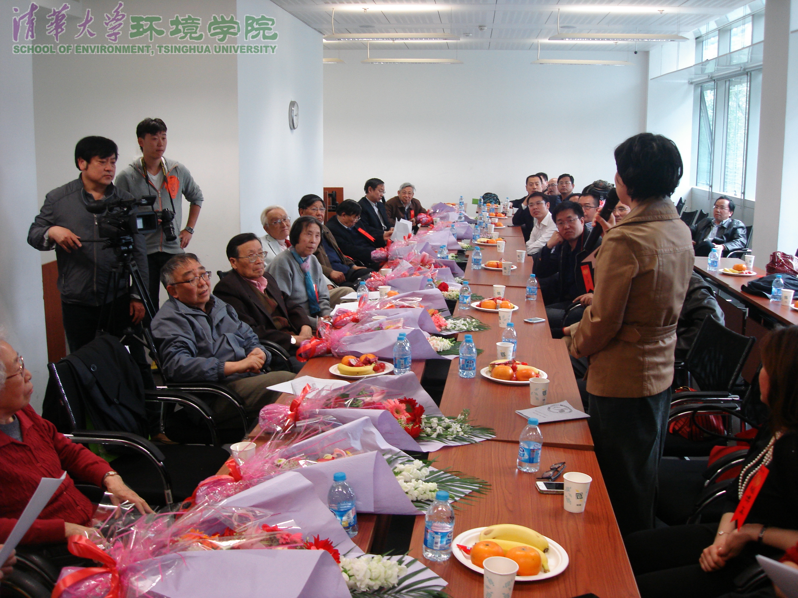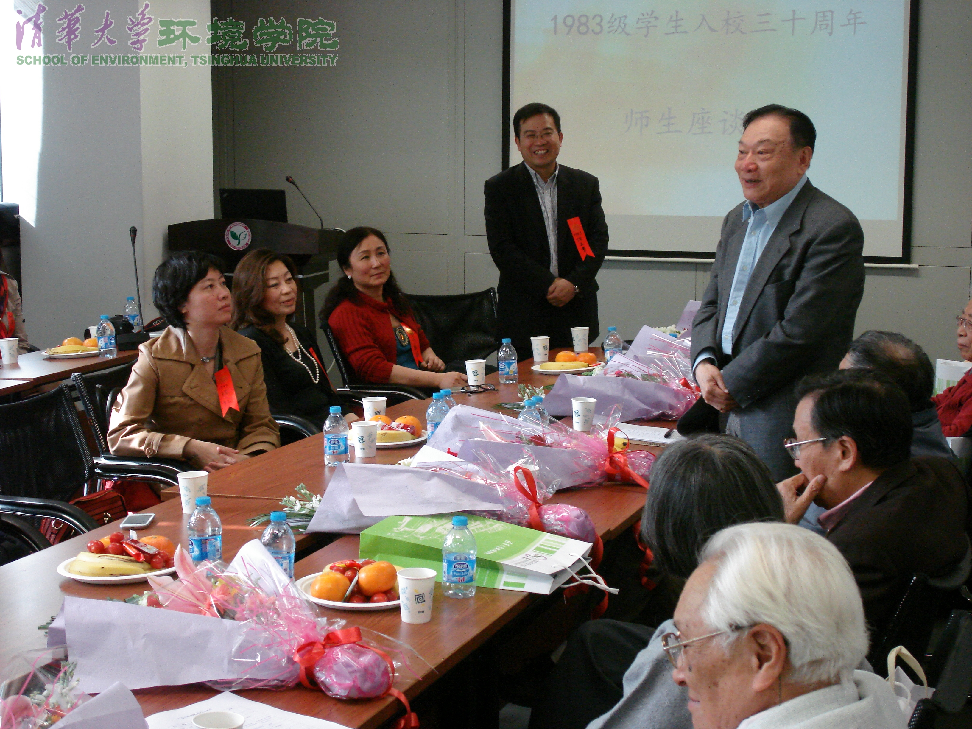 接下来校友们各自向老师们汇报了自己目前的工作和生活状况,纷纷表示母校师恩重,同窗情谊长,表达了对老教师们的感激之情和身体健康的由衷祝愿,并向老教师们献花。校友们表示,自己作为目前祖国环境事业承上启下的一代人,不管是在政府、企业的管理岗位,或是在科研一线上,都要牢记各位老师的叮嘱,秉承清华环境人奋力拼搏,勇于奉献的精神,继续为祖国环保事业的发展添砖加瓦。虽然有些校友转行从事其他行业,但仍心系环境,用自己的方式关心着我国环境保护事业的发展。