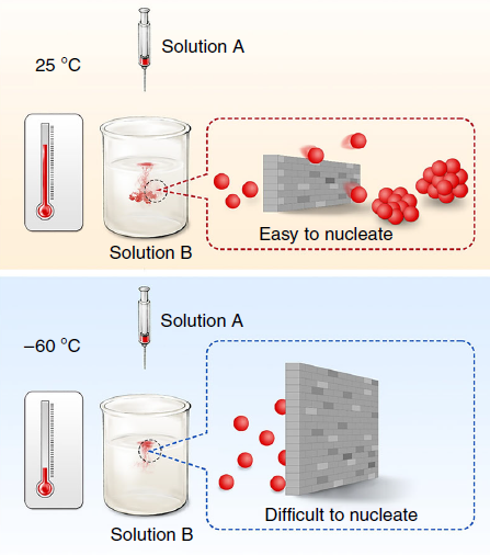 图1 零下六十摄氏度和室温溶液合成中形核调控的对比示意图