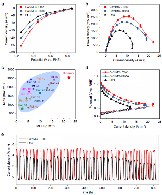 单原子催化剂或原子级分散金属催化剂的有效合成及应用,是近年来催化和材料研究领域非常重要的研究方向。由于活性组分的高度分散、金属利用效率的大幅度提升以及活性中心与相邻配位原子相互作用,单原子催化剂或原子级分散金属催化剂在诸如CO氧化反应、有机加氢反应和氧还原反应等过程中表现出优异的活性、稳定性和选择性。为了实现溶液合成策略中金属原子形核过程的动力学和热力学调控,研究团队利用低温溶液环境中显著提高的形核势垒以及停滞的形核动力学速率,提出了一种基础且通用的低温溶液合成稳定的原子级分散金属催化剂的策略 (图1)。低温溶液合成并经高温活化稳定的原子级分散金属钴基催化剂与传统团簇/纳米颗粒催化剂和商业Pt/C相比,在中性(0.05 M PBS磷酸缓冲液)和碱性(0.1 M KOH)的电解液环境中,都表现出显著提高的氧还原催化活性和稳定性。进一步在微生物燃料电池器件应用中,也表现出了远超前期文献报道的功率密度(2550 ± 60 mW m-2)和长达820小时的稳定运行(图2),能够同时实现污水处理与高性能产电。该低温溶液合成不仅提出了一种重新设计湿化学过程中形核生长的反应动力学和热力学的通用方法,更为进一步理解溶液反应的形核并利用传统溶液化学方法制备高性能催化材料提供了新的可行性。