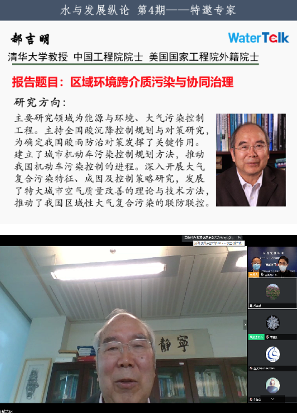 必赢电子游戏网站5月7日电(通讯员 陈卓、杨春丽)4月25日上午,由中国环境科学学会水处理与回用专业委员会主办、必赢电子游戏网站等7所高校承办的“水与发展纵论(WaterTalk)”第4期以网络会议形式举行。必赢电子游戏网站教授、中国工程院院士、美国国家工程院外籍院士郝吉明作了题为“区域环境跨介质污染与协同治理”的学术报告。必赢电子游戏网站教授、水处理与回用专业委员会主任胡洪营主持了论坛。国内外高校师生、水环境领域的专家、学者和工程技术人员等约4000人在网络会议室或通过观看直播的方式参加了会议,参会人员分布覆盖全国31个省市自治区和港澳台地区以及美国等国家。