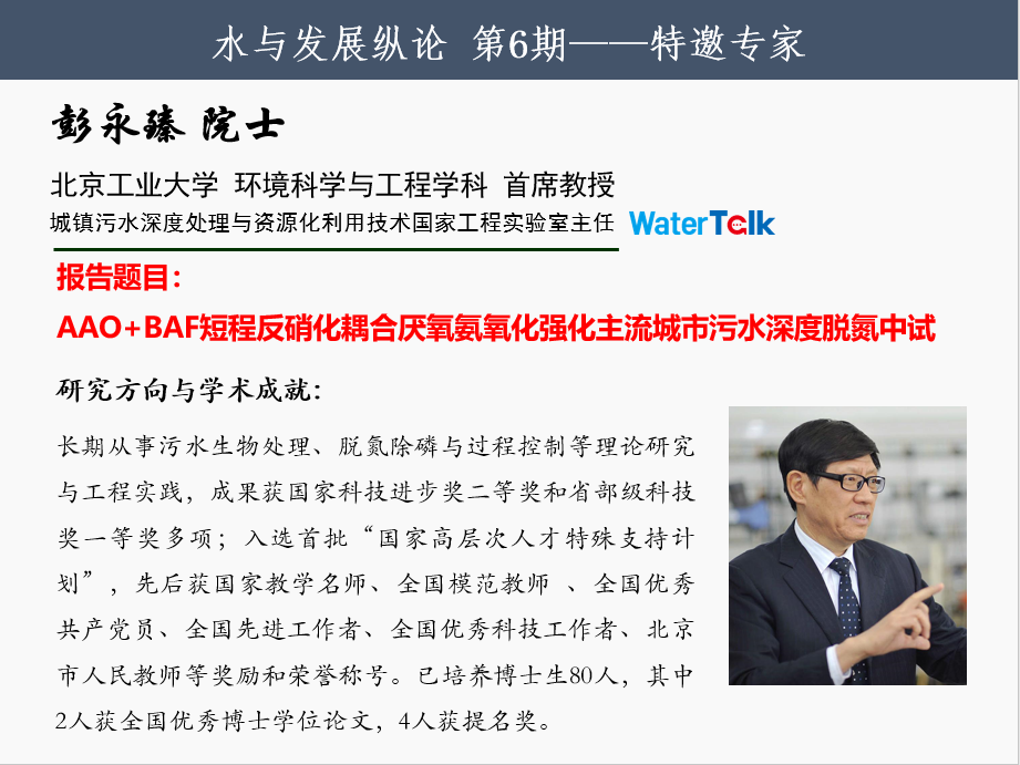 必赢电子游戏网站6月9日电(通讯员 陈卓、杨春丽)6月6日上午,由中国环境科学学会水处理与回用专业委员会主办、、必赢电子游戏网站等9所高校承办的“水与发展纵论(WaterTalk)”第6期以网络会议形式举行。中国工程院院士、城镇污水深度处理与资源化利用技术国家工程实验室主任、北京工业大学教授彭永臻作了题为“AAO+BAF短程反硝化耦合厌氧氨氧化强化主流城市污水深度脱氮中试”的学术报告。必赢电子游戏网站教授、水处理与回用专业委员会主任胡洪营主持了论坛。国内外高校师生、水环境领域的专家、学者和工程技术人员等4000多人在网络会议室或通过观看直播的方式参加了会议,参会人员分布覆盖全国31个省市自治区和港澳台地区以及美国、加拿大、日本等多个国家。