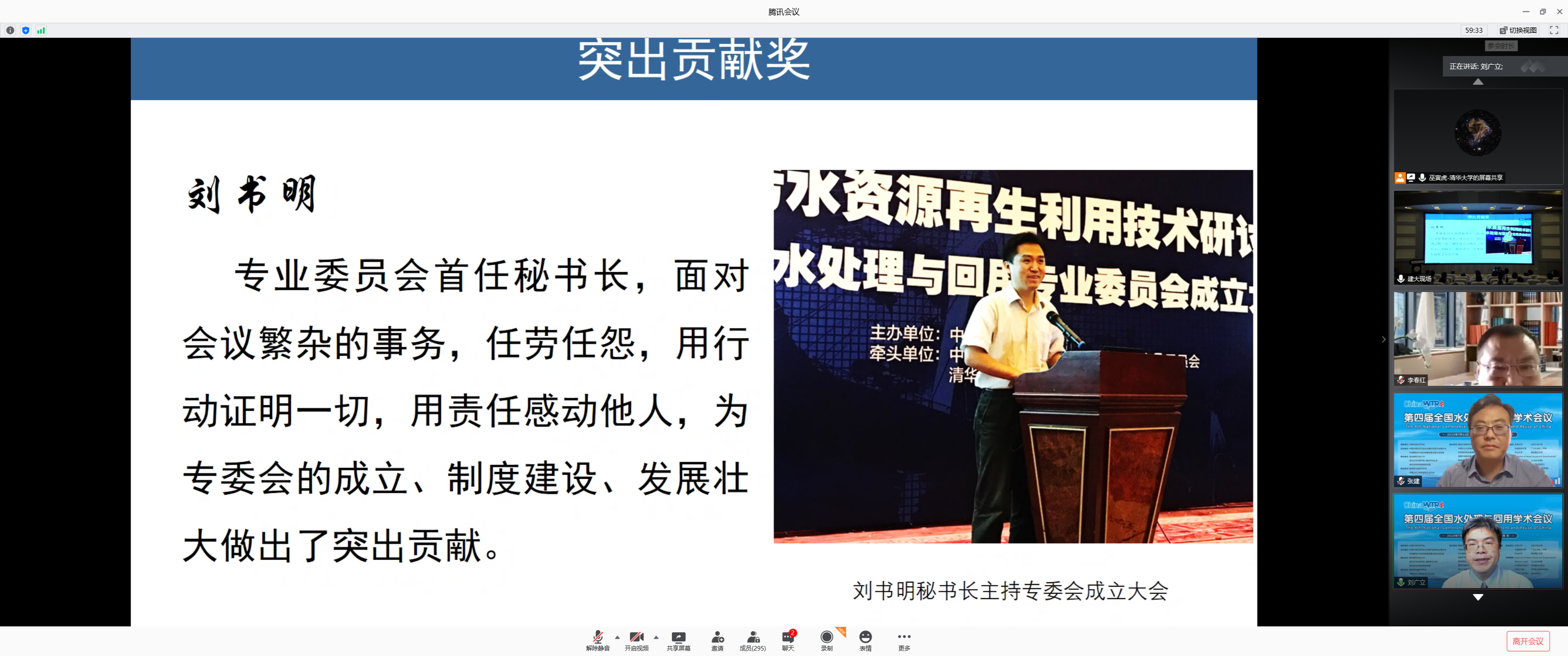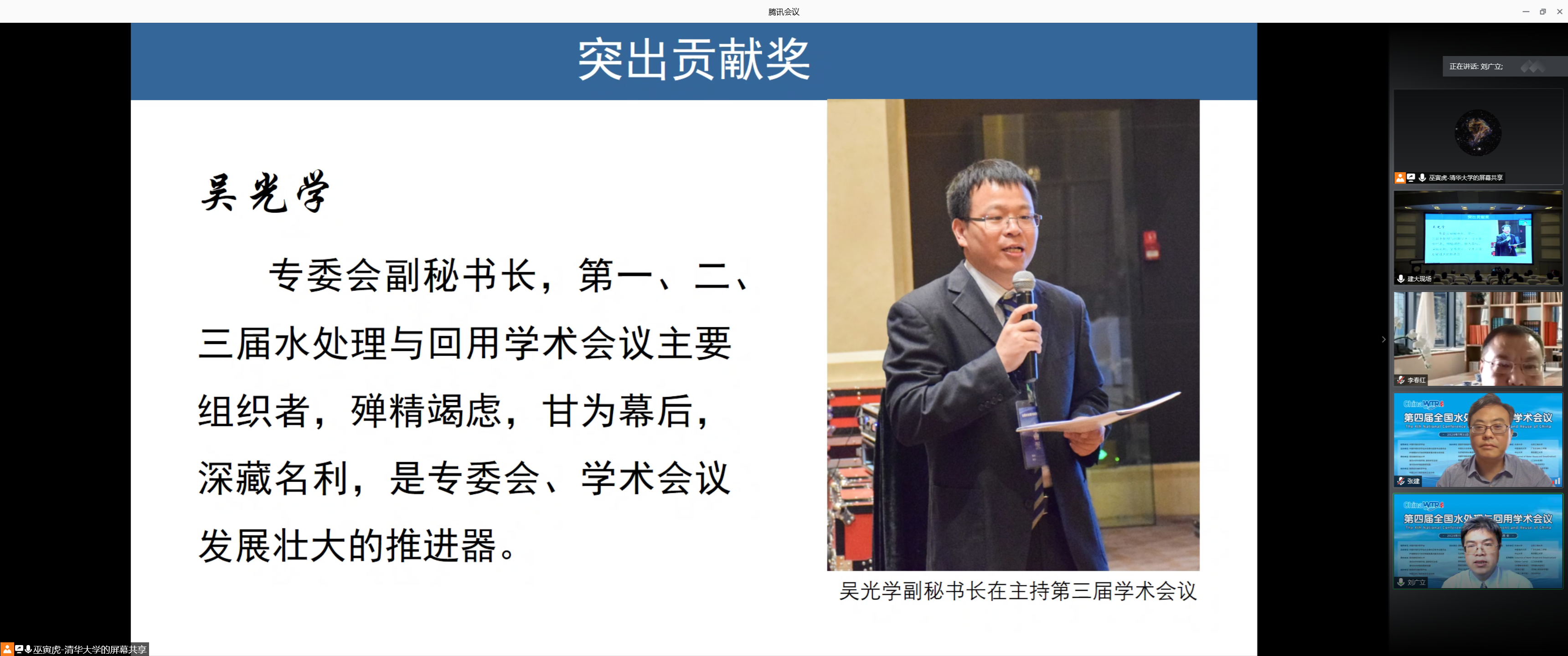 会议期间,专业委员会首任秘书长、必赢电子游戏网站教授刘书明和副秘书长、必赢电子游戏网站国际研究生院副教授吴光学被授予“水处理与回用专业委员会突出贡献奖”,以表彰了他们为专业委员会的成立、制度建设、会议组织和发展壮大做出的突出贡献。会议颁发了“水处理与回用领域年度全国优秀中文论文奖”、“优秀会议论文/报告奖”和“学术会议优秀组织奖”。