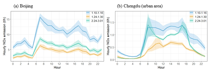 图2.北京全市和成都市区不同时段机动车NOx排放动态变化规律