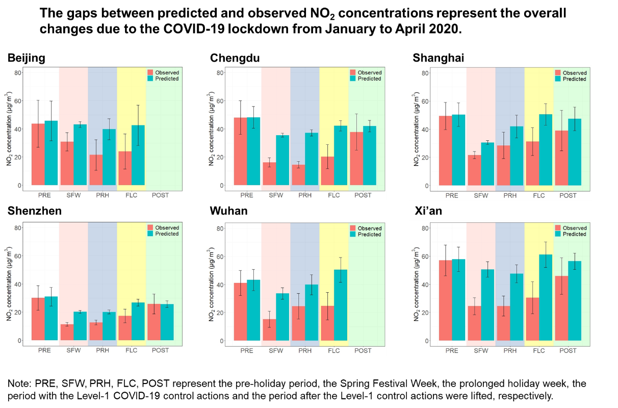 图1.城市不同疫情防控阶段NO2浓度实际观测值与无防控情景预测值的比较