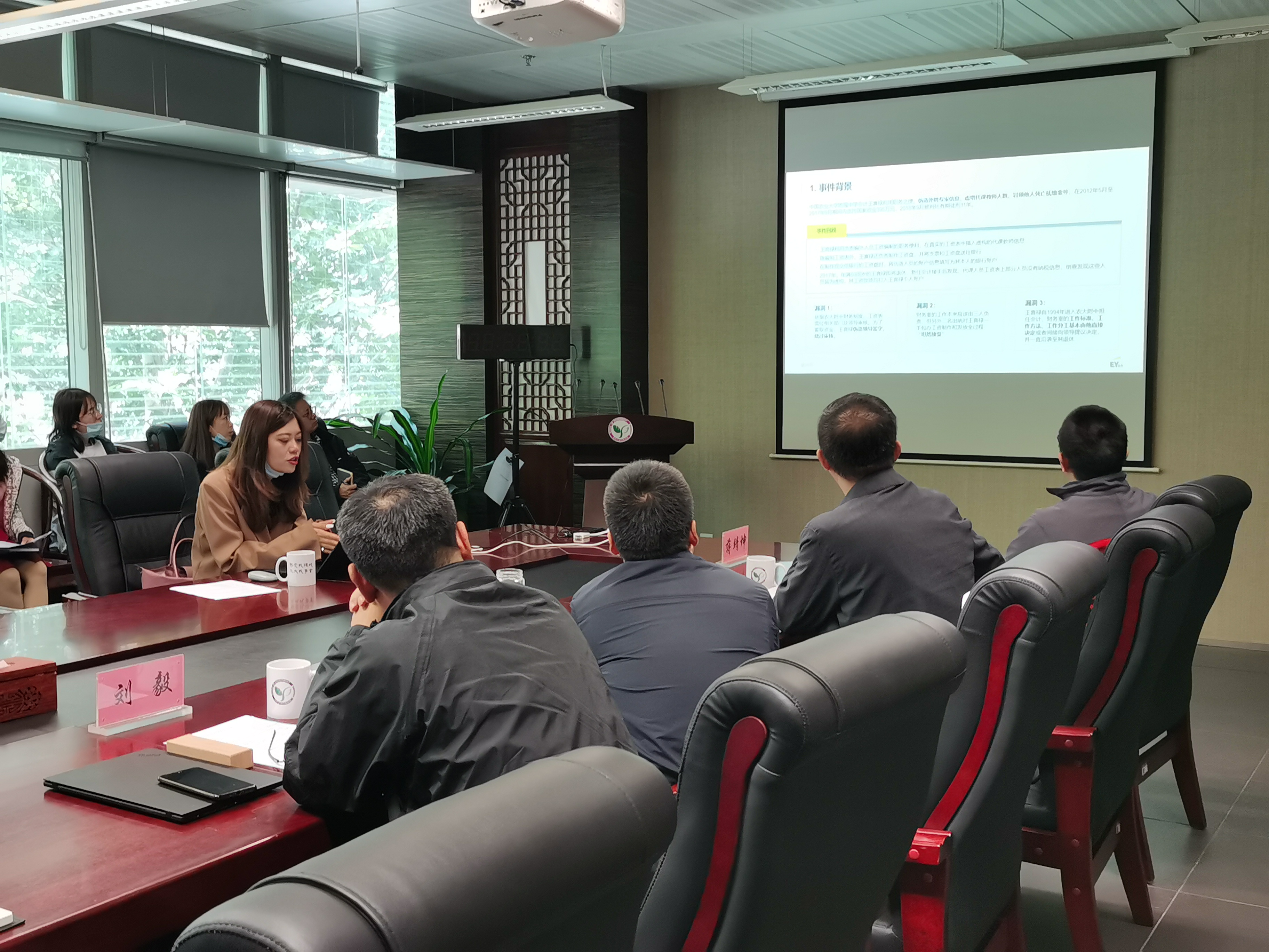 安永咨询公司高级经理苑倩接着讲解了内控基本知识、项目实施方案与配合事项,将协助学院全面认知风险、识别内部控制缺陷、提出相关管理改进建议、促进学院价值保护与创造。