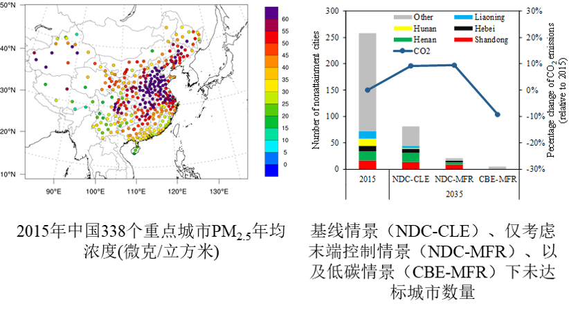 研究首次实现了综合气候评估模型(GCAM-China)与“自下而上”排放清单(ABaCAS-EI)在50多个行业技术层面的耦合对接,并进一步集成了空气质量模型(CMAQ)以及暴露响应模型(IER),模拟了2015到2035年中国的空气质量改善路径,评估了实现空气质量达标路径下温室气体的协同减排效益,量化了低碳能源政策的健康和气候影响。结果表明,在仅考虑国家自主贡献的能源情景(NDC)下,即使采用最严格的末端控制,到2035年,中国仍有一部分城市PM2.5浓度无法达标。要实现大气PM2.5浓度达到国家环境空气质量二级标准,必须采用比NDC更为严格的低碳能源政策,在提升能效以降低总能耗的同时,加大可再生能源的占比,可将主要大气污染物的排放量进一步降低6-32%。这种由空气质量达标驱动的低碳能源政策所带来的健康收益是其成本的8倍以上,最大的收益来自于减少了室内PM2.5暴露的健康影响。与此同时,这些额外的低碳能源政策可以使二氧化碳排放量在NDC基础上进一步降低22%,这与实现全球2度温升目标和我国2060年碳中和目标提出的进一步深度脱碳相一致。