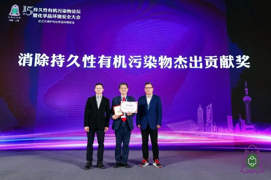 中国工程院院士、中国环境科学研究院吴丰昌研究员(右)与中国环境科学学会侯雪松副秘书长(左)为同济大学环境科学工程学院尹大强教授(中)颁发本年度“消除持久性有机污染物杰出贡献奖”