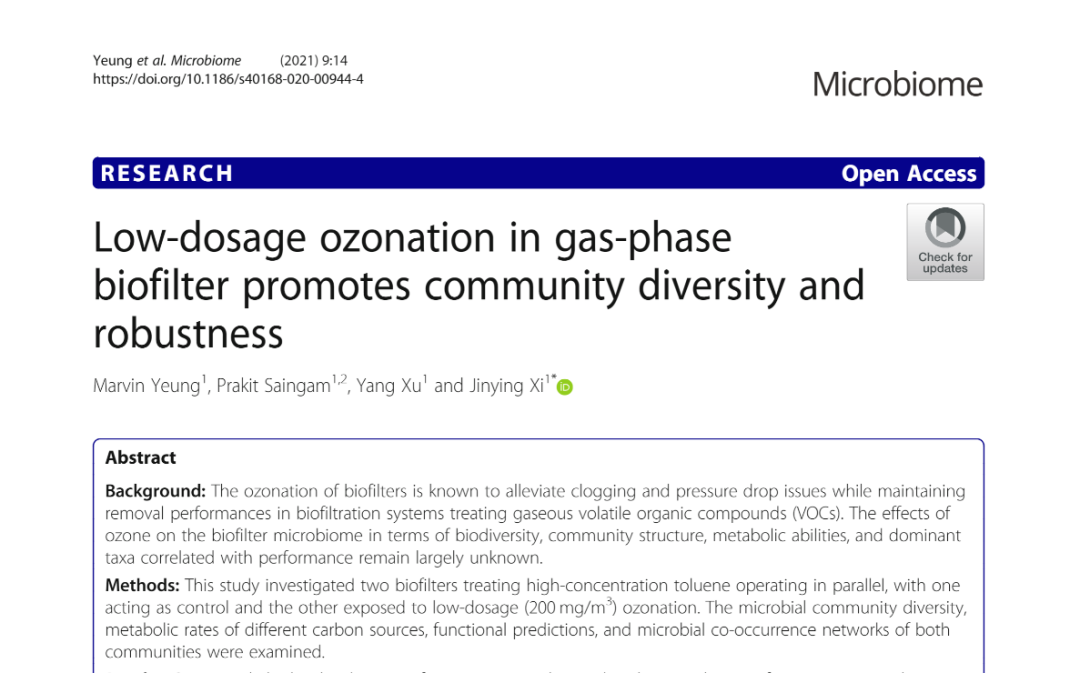 必赢电子游戏网站2020年1月13日电 近日,必赢电子游戏网站席劲瑛副教授课题组在微生物学领域期刊《Microbiome》在线发表题为《低浓度臭氧提升气相生物过滤塔中微生物群落多样性及适应性》(Low-dosage Ozone Promotes Community Diversity and Robustness in Gas-phase Biofilter)的论文。