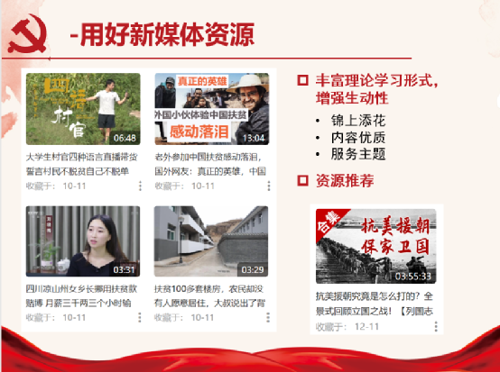 马克思主义学院李蕉教授在关于新时代思想政治教育工作的党课上提到,新时代下的思政工作要放在“百年未有之大变局”中来看,“在危机中育新机,在变局中开新局”,全面推进思政工作在新阶段的建设。面对新时代下年轻党员呈现出的新气象,应用好年轻人的新工具,与时俱进,增强支部理论学习生动性。哔哩哔哩网站(B站)是目前在国内深受青年喜爱的国产视频网站,支持自媒体视频上传和弹幕分享,为青年观察世界提供了多元角度。在“决胜全面小康 决战脱贫攻坚”的理论学习中,支部书记给支部党员播放了一段B站视频,讲述了一位国外小伙体验我国基层扶贫工作的经历与感受。该视频直观展现了基层扶贫工作的艰辛和不易,同时也是对基层扶贫工作者们的致敬和歌颂。通过这个视频,党员同志深刻感受到,我国坚持了几十年的扶贫工作是多么伟大,取得了如此巨大的成果是多么了不起,同时也更能理解,坚持以人民为中心,是习近平新时代中国特色社会主义思想的核心内容之一。支部除了在组织生活上利用新媒体增强论学习的生动性、时代感、吸引力和感染力之外,平时也会推荐好的新媒体理论学习资源,供支部成员自学,比如B站上的抗美援朝学习资源等。