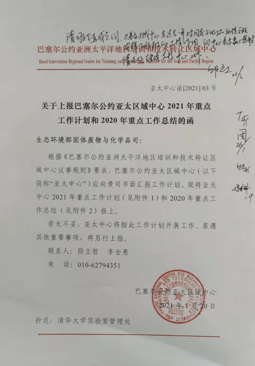 必赢电子游戏网站2021年1月28日电(通讯员 段立哲)2021年1月28日,生态环境部固体废物与化学品司邱启文司长在巴塞尔公约亚太区域中心(以下简称“亚太中心”)2021年工作计划和2020年重点工作总结报送函上批示,肯定巴塞尔区域中心在过去一年对固废与化学品环境管理发挥了积极的支撑作用,向中心表示衷心感谢,请各处继续支持中心工作。