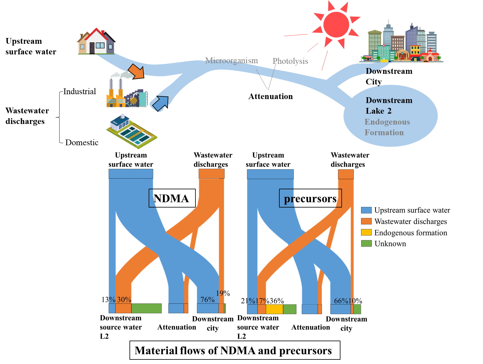 研究结果表明,上游地表径流向位于该城市下游的某水源地汇入了13±4%的NDMA和21±3%的NDMA前体物;该城市的生活污水和工业废水排放向下游水源地汇入了30±8%的NDMA和17±2%的NDMA前体物;水源地自身的微生物代谢最多可贡献36%的NDMA前体物。因此,上游地表水汇入和当地污废水排放是下游水源地中重要的NDMA来源;上游地表水汇入、当地污废水排放和水源地自身的微生物代谢是重要的NDMA前体物来源;自然衰减机制仅去除了部分径流机制带来的污染物负荷。论文提示,不仅要关注供水系统内作为新型消毒副产物的亚硝胺类生成,也要关注水环境中作为新型污染物的亚硝胺排放。本论文工作为全面、系统认识饮用水亚硝胺风险的来源,制订针对性的控制策略提供了重要的技术思路。