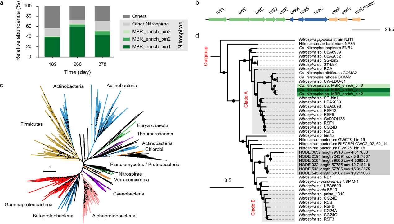 图3 MBR中微生物群落检测到的ure操纵子。(a)群落中含脲酶微生物的相对丰度。从三个宏基因组中提取所有的ureC基因,并通过计算特定ureC基因与所有检测到的ureC基因的比对片段数目估算它们的相对丰度。(b)Nitrospira属中脲酶和尿素转运操纵子示意图。箭头代表基因,表示转录方向。(c)从所有公开可用的原核基因组中提取的编码ureABC蛋白序列的系统发育树。(d)从所有公开可用的Nitrospira属中提取的编码ureABC蛋白序列的系统发育树。这两个系统发育树都是用1000次bootstrap复制计算的,黑色圆圈表示bootstrap支持度为70%。