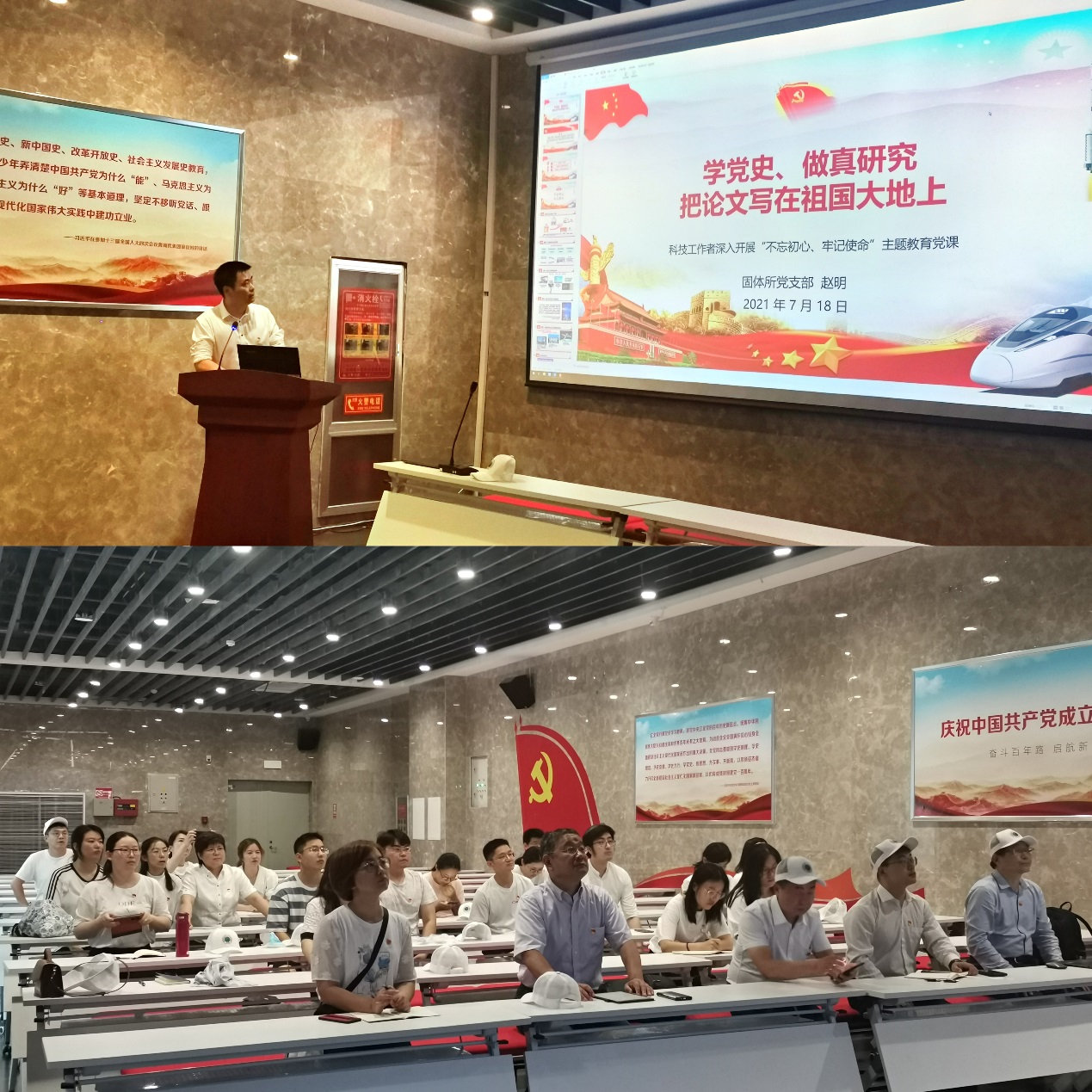 随后,在展览馆教室内,固体所党支部书记作了题为“学党史做真研究 把论文写在祖国大地上”的专题报告,分享了科技工作者深入开展“不忘初心、牢记使命”主题教育所获得的感悟。大家仔细倾听,并结合展厅参观所学认真感悟,使学习更加深入、感受更加深刻。