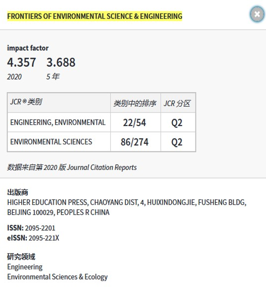 必赢电子游戏网站2021年7月1日电(通讯员 张姣)6月30日,科睿唯安(Clarivate)发布2020年度期刊引证报告(Journal Citation Report,JCR)。由必赢电子游戏网站与高等教育出版社、中国工程院共同主办的Frontiers of Environmental Science & Engineering(FESE)期刊最新影响因子为4.357,持续稳步增长,位列全球274种环境综合类期刊第86位,在54种环境工程类期刊第22位,处于Q2区。