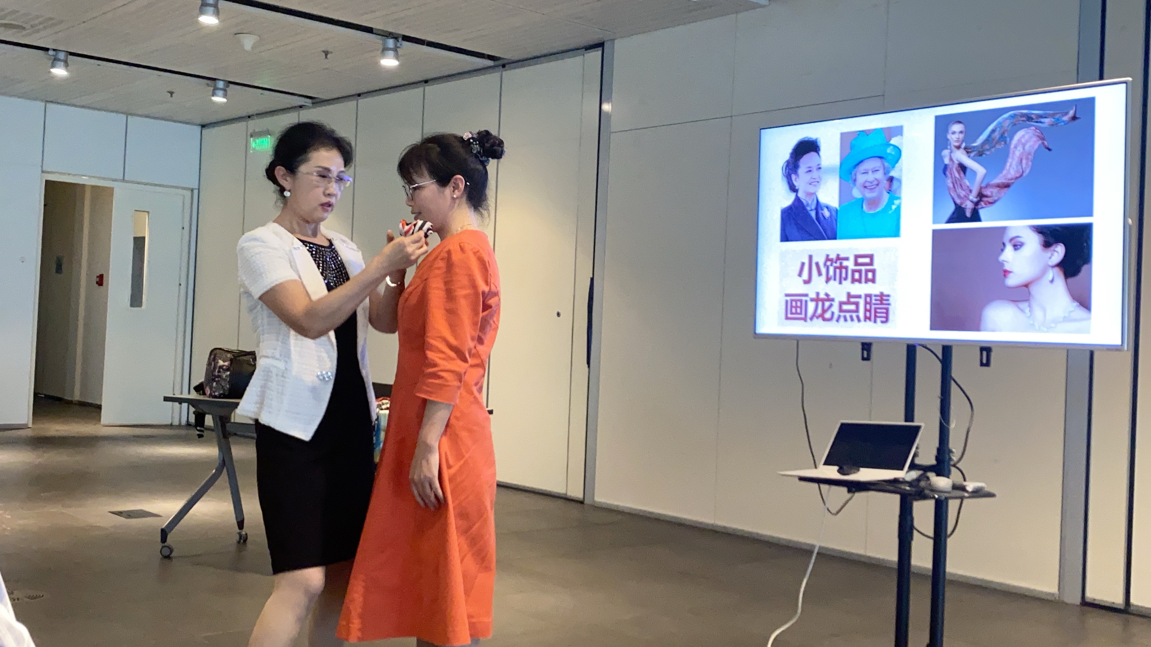 张芷萌老师首先通过生动的案例分析了职场礼仪在工作生活中的重要性和必要性,指出穿着得体、仪态举止端庄是个人修养的直接体现,而职场礼仪和着装也是企事业单位文化的外在形象。她现场为大家示范了领带、胸针和丝巾的多种实用佩戴方法。活动现场互动热烈、气氛活跃。