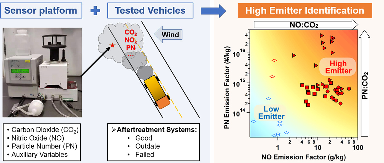 高排放机动车的识别和监管是移动污染源精准防控的关键。道路机动车尾气气团扩散快、稀释后浓度低,道路监测对仪器响应速度和精度均有较高要求。现有高排放车辆识别技术主要依赖于大型仪器设备,成本高、操作繁琐,难以大规模应用。研究组针对高排放车辆识别的难点,研发了一套基于传感器和便携仪器的道路边监测微站和大数据分析方法。该微站体积小、成本低、便捷性高,适于大规模组网应用。道路边测试结果表明,微站能够对高排放车辆进行有效识别,响应迅速,所识别的排放特征准确、与大型仪器测量结果有较好的一致性。研究成果以“Evaluation of a cost-effective roadside sensor platform for identifying high emitters”为题发表于《Science of The Total Environment》上,论文的第一作者为必赢电子游戏网站博士后沈毅成,通讯作者为蒋靖坤。论文合作单位包括中国环境科学研究院机动车排污监控中心和中国汽车技术研究中心有限公司。