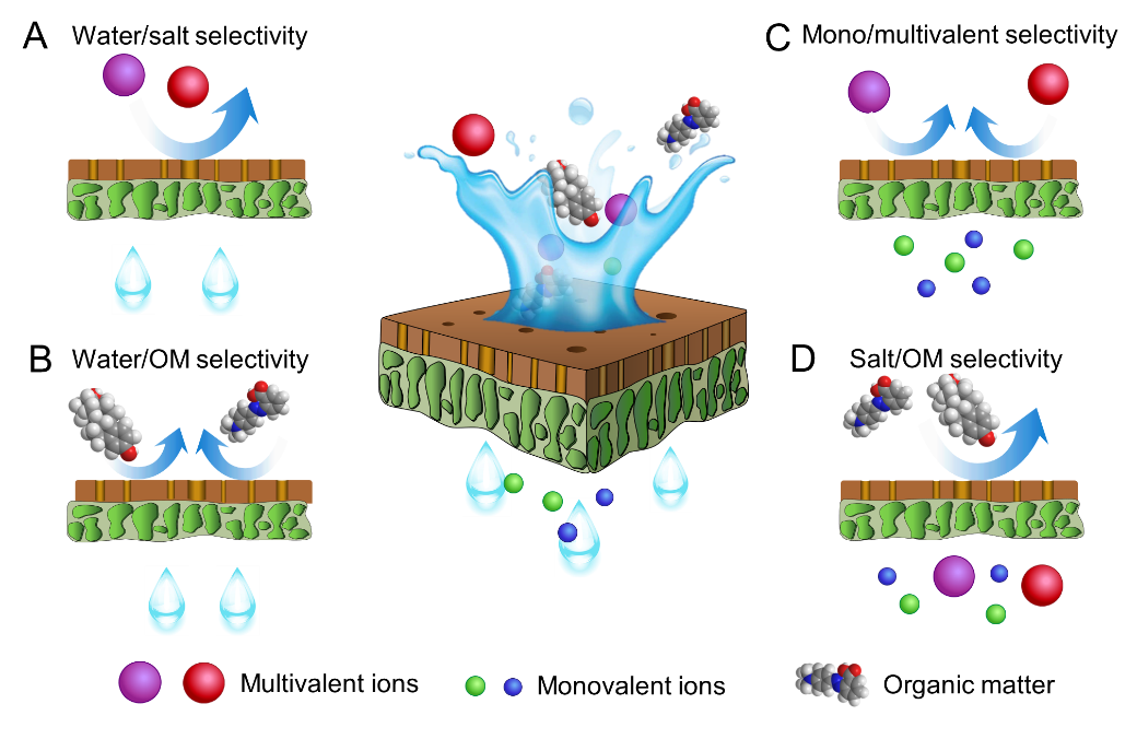 本研究对纳滤膜的选择性进行了系统分类,即水/离子选择性、水/有机物选择性、单价/多价离子选择性、离子/有机物选择性。根据不同应用场景的分离需求,系统地讨论了现有不同材料和制备工艺的纳滤膜在水处理中的应用现状和前景,包括市政水处理中消毒副产物前驱体和微量污染物去除、工业给水除硬和高盐废水零排放、盐湖锂镁分离等领域,旨在填补水处理行业对不同种类高性能纳滤膜的迫切需求和近年来学术界发表大量关于纳滤膜制备文献之间长期存在的鸿沟,根据不同水处理行业的需求,指明未来纳滤膜制备与调控的方向。