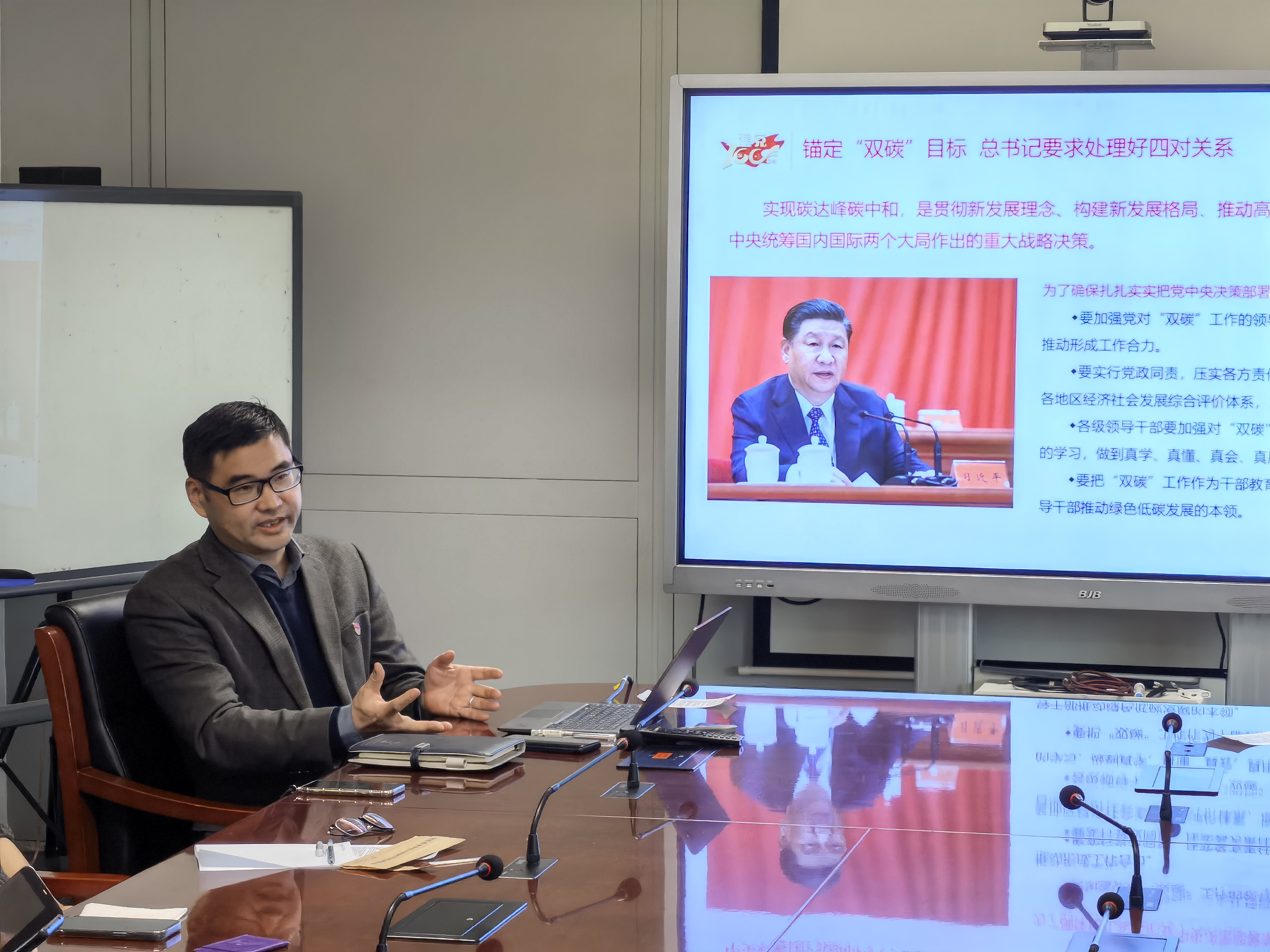 鲁玺在党课中介绍,习近平总书记的重要讲话肯定了我国为推动“双碳”目标实现所做的努力,同时也强调面对“破解资源环境约束突出问题、实现可持续发展;顺应技术进步趋势、推动经济结构转型升级;满足人民群众日益增长的优美生态环境需求、促进人与自然和谐共生;主动担当大国责任、推动构建人类命运共同体”等四个迫切需要,必须处理好“发展和减排、整体和局部、长远目标和短期目标、政府和市场”等四对关系。习近平总书记再次强调了推进“双碳”工作必须坚持“全国统筹、节约优先、双轮驱动、内外畅通、防范风险”的工作原则,并作出了“加强统筹协调、推动能源革命、推进产业优化升级、加快绿色低碳科技革命、完善绿色低碳政策体系、积极参与和引领全球气候治理”等六项工作部署。