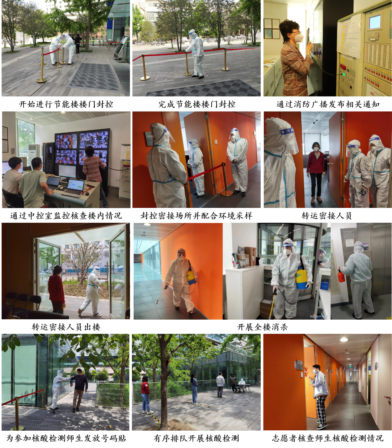 本次演练模拟有阳性人员到访节能楼并已离开的情景。在接到学校通知后,学院立即启动突发疫情应急处置程序,成立节能楼封控应急工作组,并依托学院现有工作体系,建立指挥协调、教职工联络、学生管理、楼宇安全、后勤保障、舆情监测与应对等六个专项工作小组,第一时间排查密切接触者,通过消防广播通知、面对面建群、共享文档等多渠道收集汇总楼内人员、课程、物资等信息,并及时与疾控中心对接实施密切接触者转运、环境采样及消杀工作,同时研究制定进出楼路线,组织开展流行病学调查,联系快速开展核酸检测等工作,随后有序组织各楼层人员到节能楼南侧开展核酸检测。最终,在楼人员全部完成核酸检测,且检测结果全部阴性,节能楼解除封控,演练正式结束。