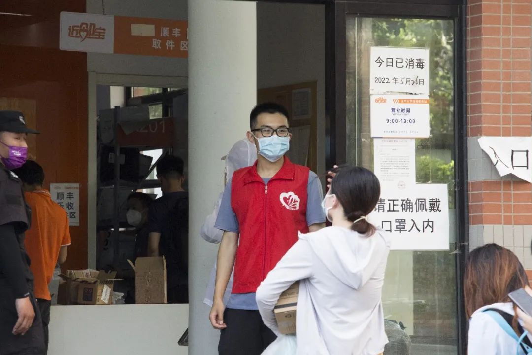 5月26日傍晚,环9、环0党支部的同学们先后到紫荆14号楼近邻宝快递服务中心参与快递点运营支持志愿工作。他们身穿红马甲,在快递点前引导收寄快递的同学们有序停放自行车、排队、扫码后进入快递点大厅取件或寄件,有效减轻了拥堵情况,减少了人群聚集的风险。在工作中,同学们对快递点的防疫措施、运行模式、实际工作量等都有了进一步的认识,也切身体会到工作人员的辛苦。