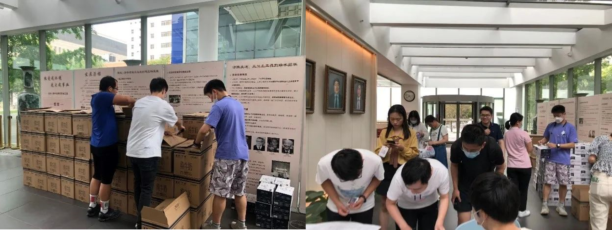 6月3日上午10点,订购物资准时到货。学院学生骨干为同学们分装、清点、打包物资。
