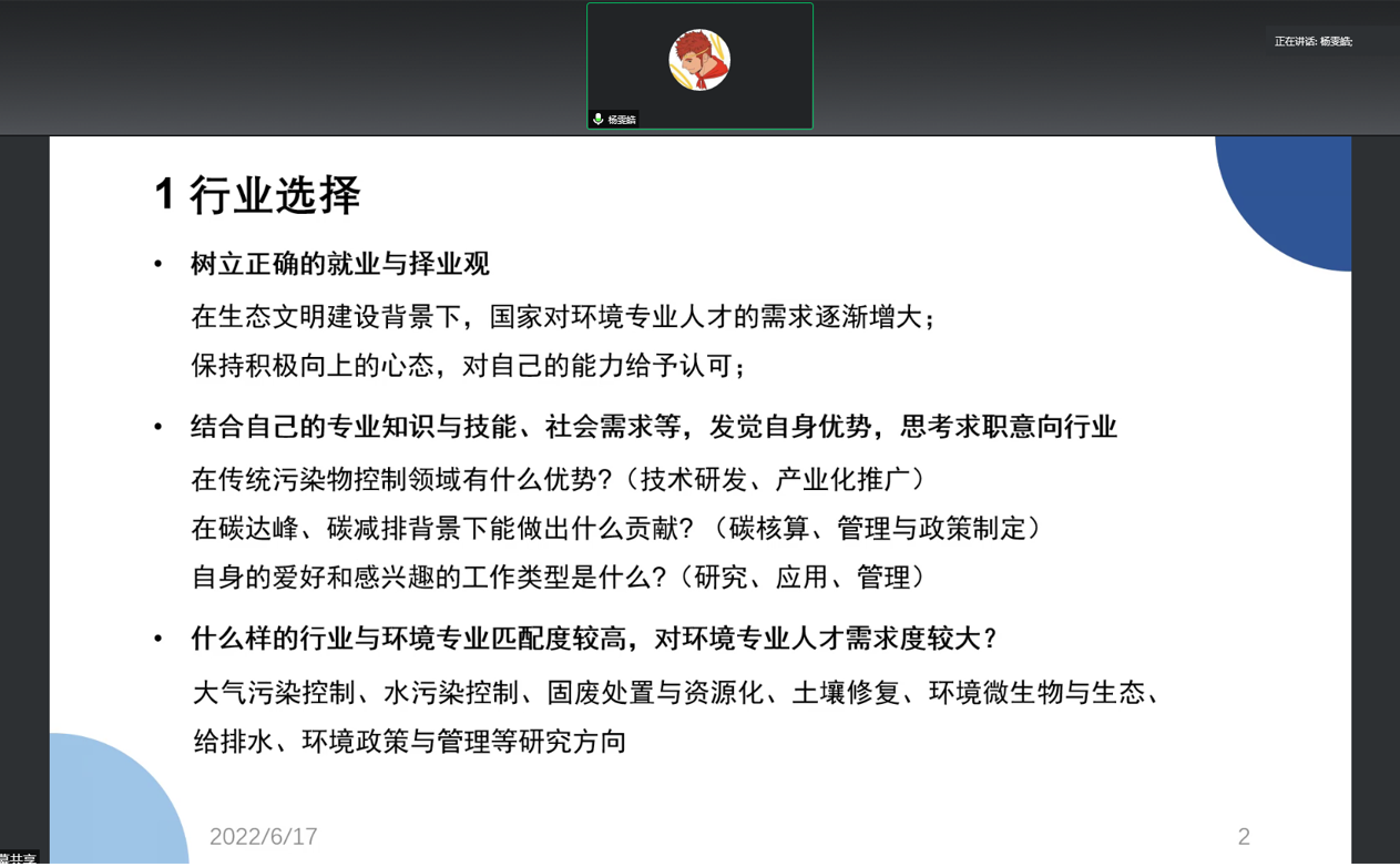 本次主题活动中刘书明老师提到,必赢电子游戏网站的发展一直紧密结合国家重大需求。当前生态文明建设已经上升为国家战略,环境治理也发展到跨介质的系统性治理阶段,需要统筹多部门、多行业、多方法、多污染物。我认为,环境工程专业的研究生职业发展也具有这个特征,即可以从多学科多角度着手解决环境问题。我们应该从全局角度掌握环境领域发展大方向,同时培养个人的技能特长,从科学研究、行政管理、工程应用、经济金融等角度为生态文明建设服务。
