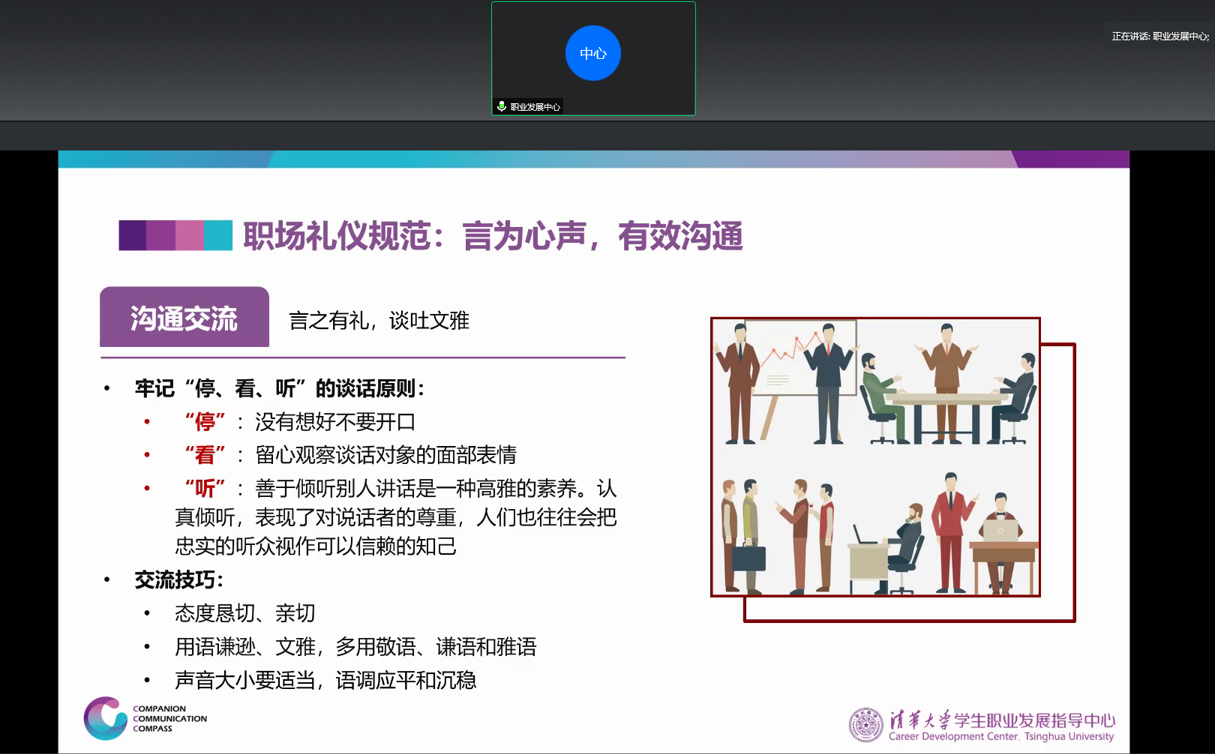 关晓壮从职场礼仪规范与职场思考两方面为大家带来了一场职前辅导。他详细介绍了职场穿着、言行举止以及社交礼仪等职场礼仪规范,并从社交、工作和心态三方面对如何快速适应职场提出了专业辅导建议。他叮嘱大家在工作岗位上既要忘记自己是一个“清华”人,又要牢记自己是一个“清华”人,摆正心态,勤思勤问。