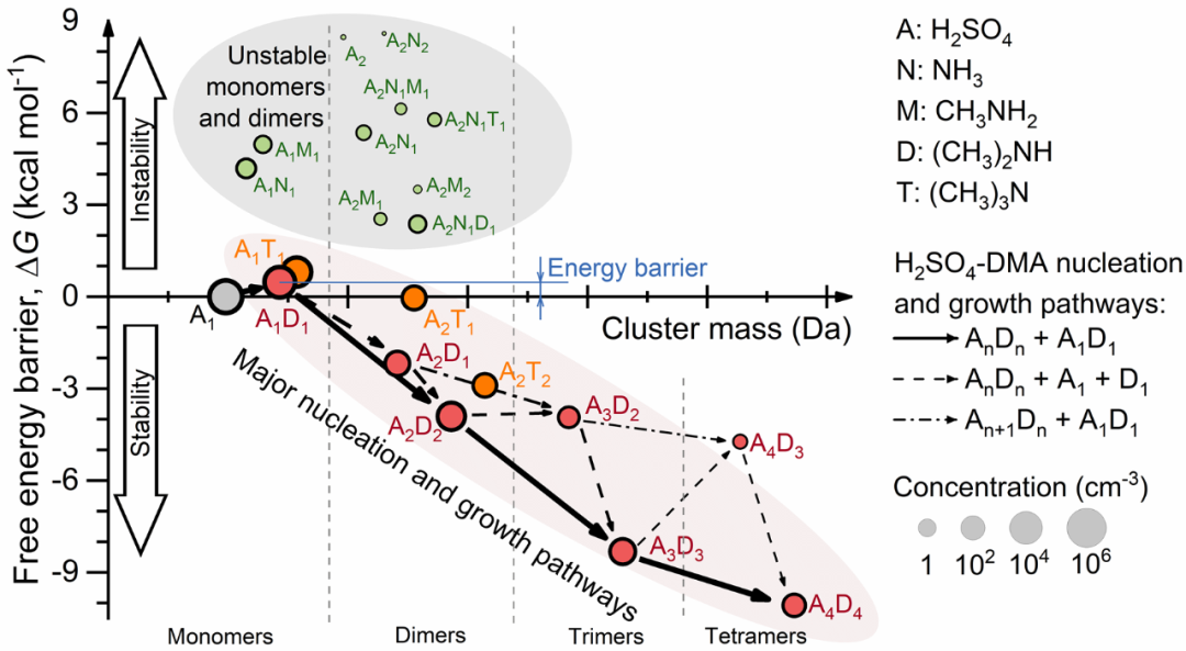 结合理论与观测,研究团队提出:酸碱双分子团簇的生成是新粒子生成的关键机制。相比于传统的硫酸双分子团簇生成机制,酸碱双分子团簇具有更高的化学稳定性,可以更高效地生成含两个或更多硫酸分子的稳定团簇,从而更高效地生成新粒子。