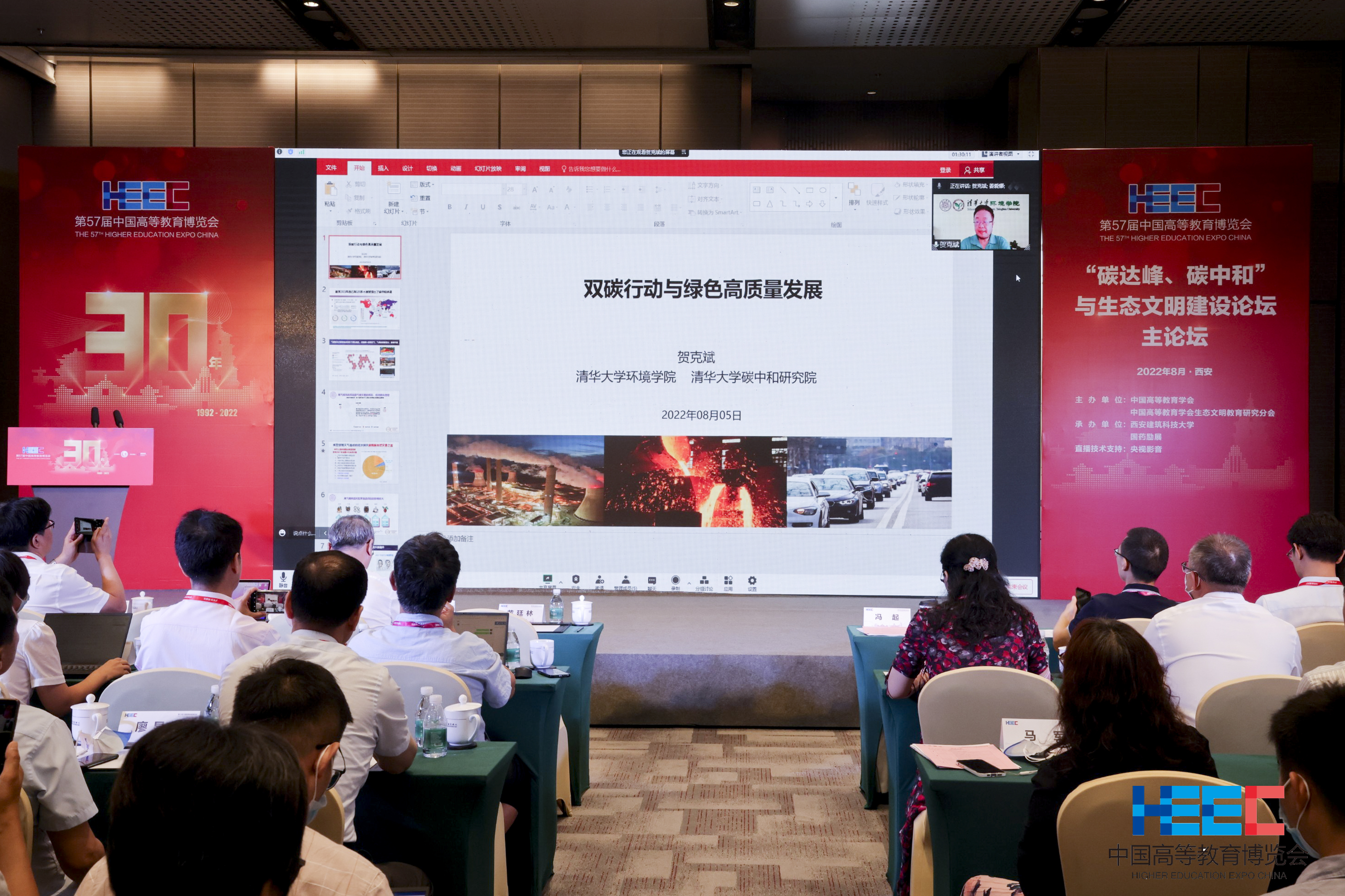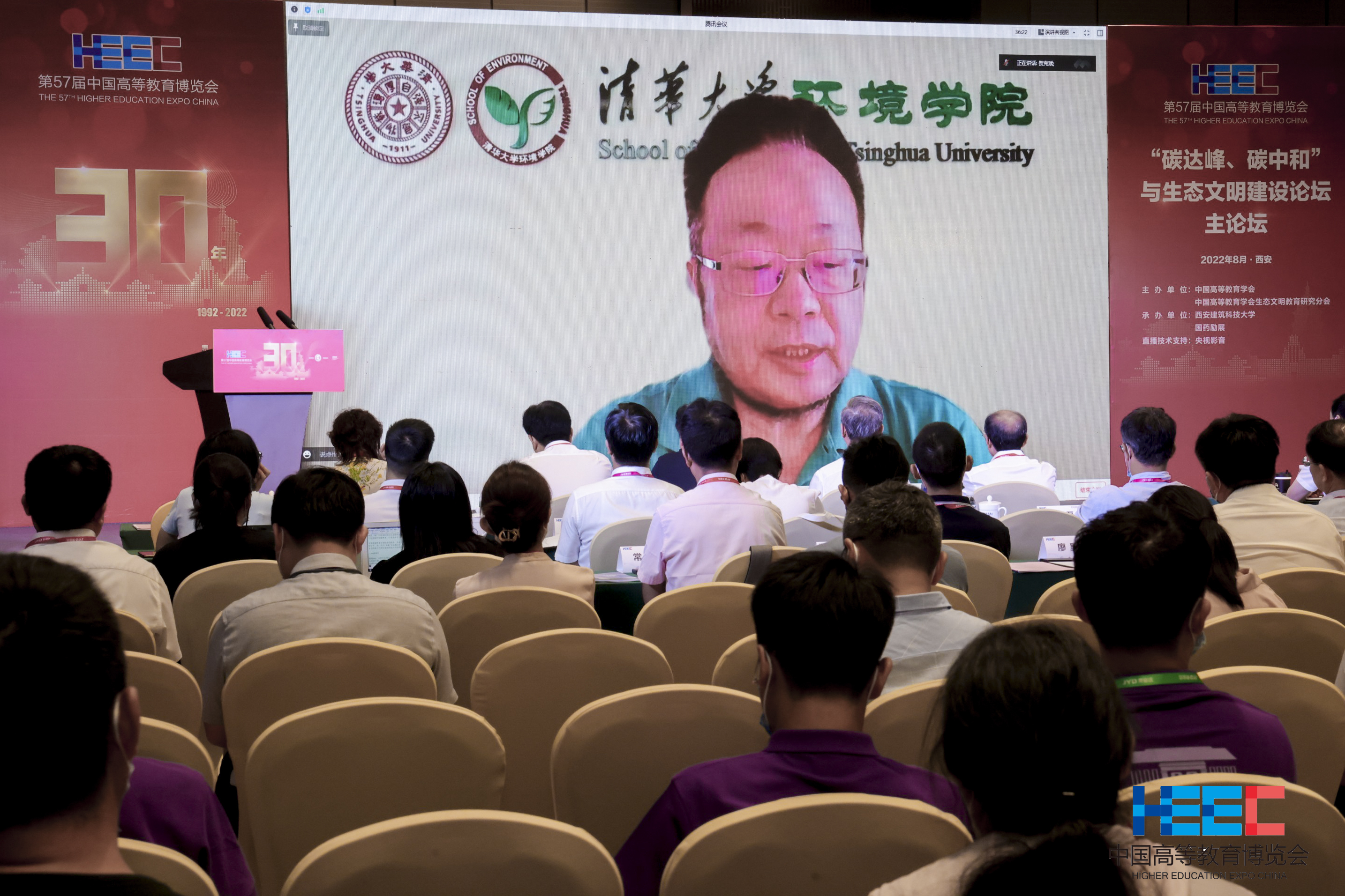 中国工程院院士杜祥琬,中国工程院院士、中国高等教育学会生态文明教育研究分会理事长贺克斌,中国科学院兰州分院党委书记兼院长冯起院士,中国高等教育学会监事长孙维杰,西安建筑科技大学副校长黄廷林,中国循环经济协会会长朱黎阳,生态文明教育研究分会秘书长温宗国,西安建筑科技大学环境与市政工程学院院长卢金锁,南开大学生态文明研究院副院长徐鹤等出席会议。论坛以线上线下结合的方式召开,来自近100个单位的150位代表现场参会,超过130万人次通过央视频在线上观看直播。