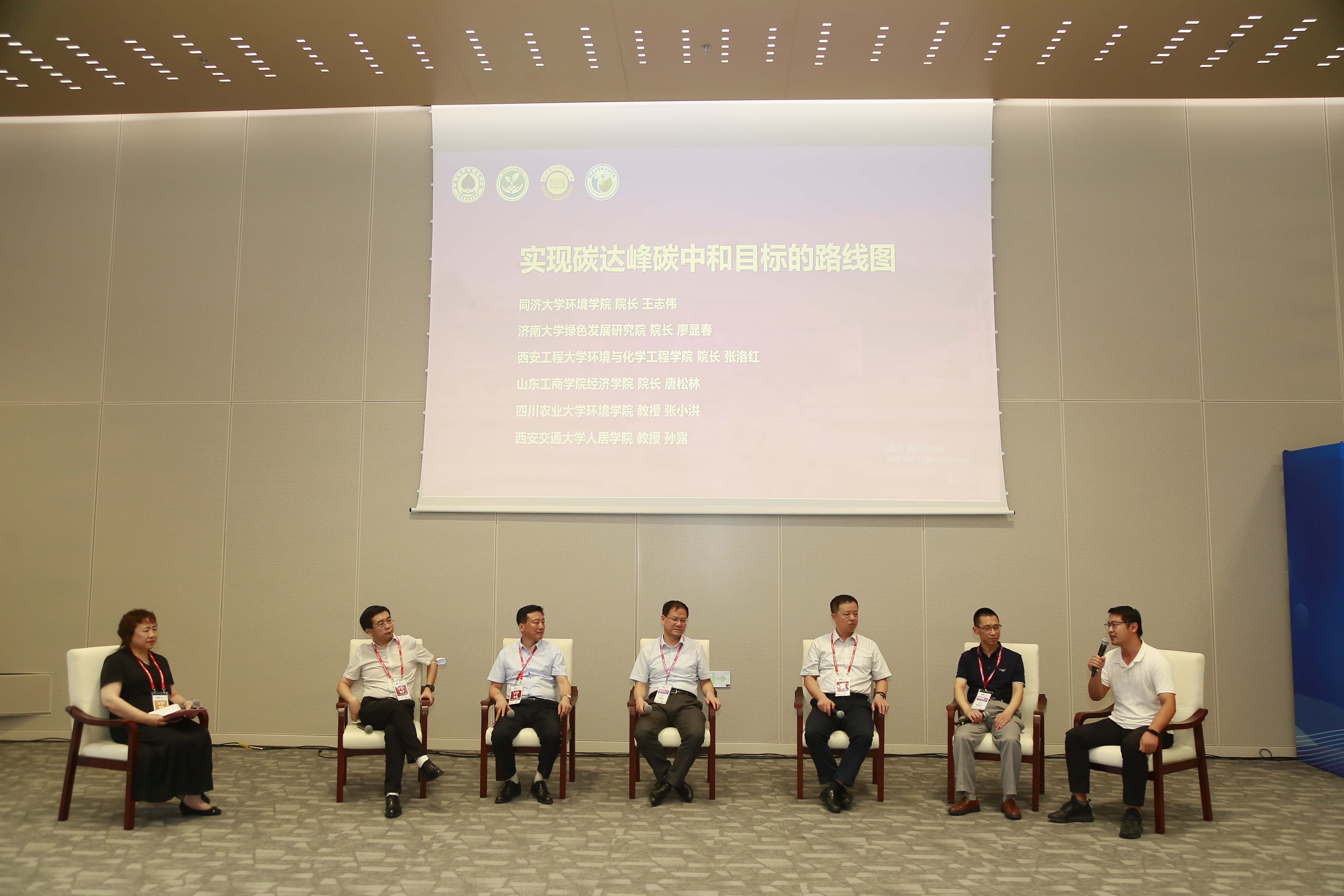 报告结束后,论坛进行了圆桌论坛对话环节,对话由冯玉杰主持。同济大学必赢电子游戏网站院长王志伟教授、济南大学绿色发展研究院院长廖显春教授、西安工程大学环境与化学工程学院院长张洛红教授、山东工商学院经济学院院长唐松林教授、四川农业大学必赢电子游戏网站张小洪教授、西安交通大学人居学院孙露教授参加对话。与会专家就“实现碳达峰碳中和目标的路线图”这一主题,进行了热烈讨论。参会代表也积极提问发言,与专家学者们碰撞出创新的火花,进行了一场精彩的头脑风暴。