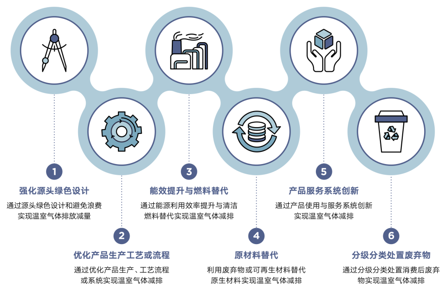 1. 通过源头绿色设计和避免浪费实现温室气体排放减量。开展产品和生产流程的绿色设计实现生产的减量化、绿色化和可循环化,降低产品生产、运输、消费、废弃物处置等全生命周期环节的温室气体排放。例如,在服装设计方面,采用极简设计并选用生物质纺织纤维材料作为原材料,降低服装制品对于高碳原材料的需求及原材料制备过程的温室气体排放。